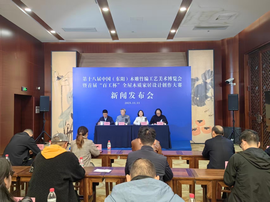 11 月 11 日,第十八届中国 (东阳) 木雕竹编工艺美术博览会暨首届“百工杯”全屋木质家居设计创作大赛新闻发布会在浙江省东阳市中国木雕博物馆召开。第十八届东博会暨首届 “百工杯” 大赛将于 11 月 14 日至 23 日在东阳中国木雕城国际会展中心举办,以 “匠心传经典・新质向未来” 为核心主题,通过 “赛事+展会+交流” 的多元形式,推动传统木雕工艺与现代生活深度融合,为东阳木雕家居产业转型升级注入新动能。