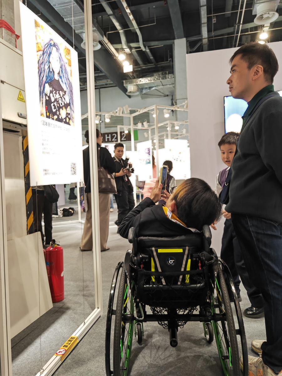 事实上,某一种罕见病的患者人群罕见,但世界上数千种不同罕见病的人群基数依然庞大。此次携作品参展的蓝剑儿,自幼被“肌肉萎缩”困扰,直至前年才确诊为脊髓性肌萎缩症(SMA),而长年病痛从未困住他的创作力。43岁的他,用全身上下仅能活动的两根指关节,创作出2组作品,展现他天马行空的数字绘画风格。