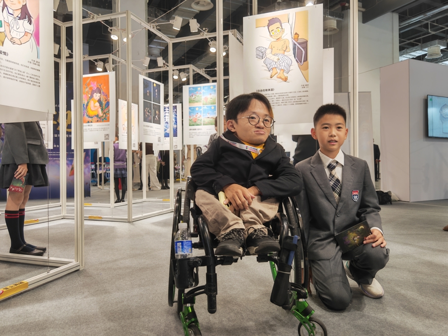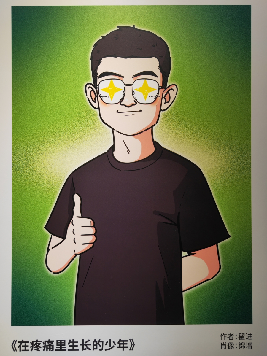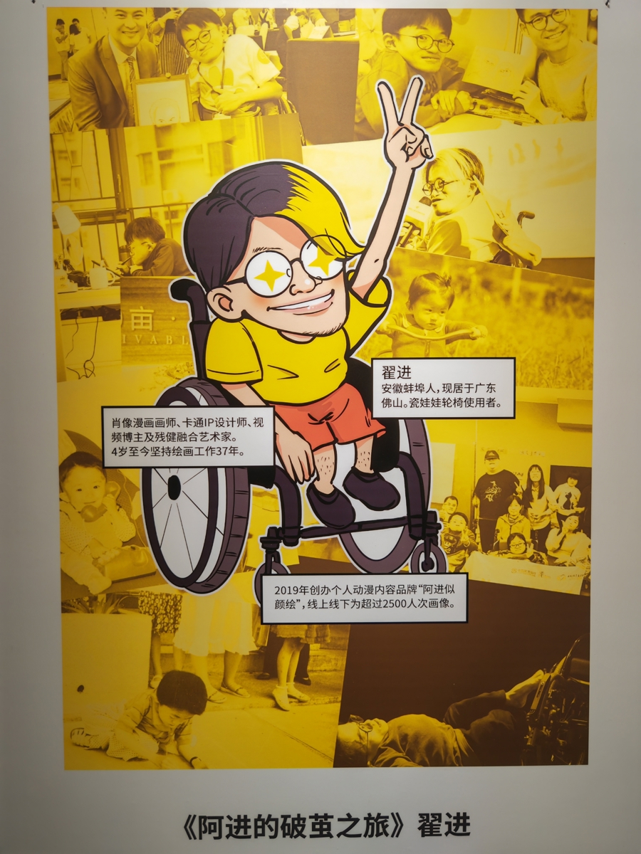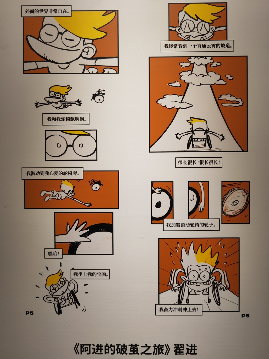 如今,从插画到动画,翟进的画风转向明亮,并开始用画笔记录与他人的联结。他创立动漫设计工作室“阿进似颜绘”,结识更多与自己同病相“乐”的罕见病病友。这次画展上,他不仅为自己创作出多格连续漫画,还将长期积累的罕见病患故事,以图文并茂的形式呈现如何活出韧性的快乐。“其实我们‘瓷娃娃’并非只有悲伤和苦痛,也有欢乐与自由的一面值得分享,希望更多人能了解到这一点。”