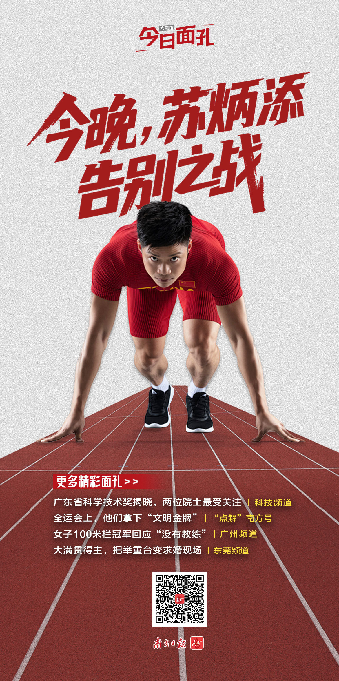 这是苏炳添第五次参加全运会,也将是最后一次,“我希望能为广东队站好最后一班岗。”作为广东中山人,在家门口举办的比赛上跑完最后一次男子4×100米接力项目,苏炳添觉得这是自己理想中的退役形式。“不管是失败也好,赢也好,我都想在自己的战场上面去结束自己的体育生涯。” 回顾“亚洲飞人”的封神之旅>>
